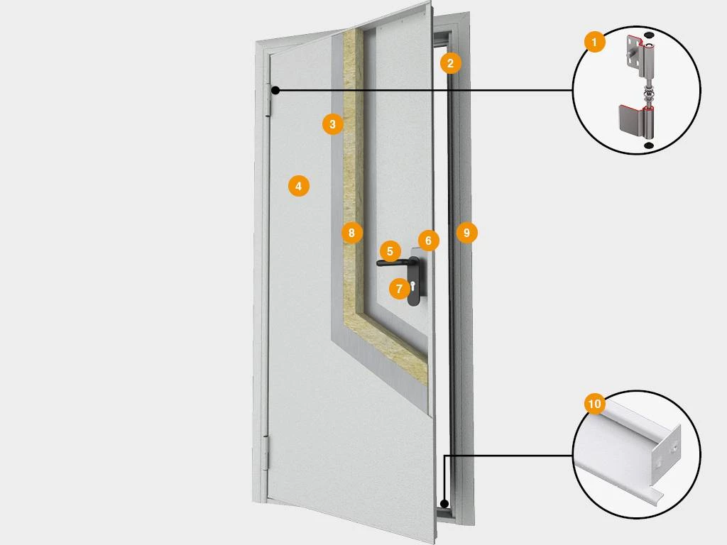 С наружной и внутренней стороны дверь окрашена порошковой краской в RAL7035 (светло-серый) и имеет структуру поверхности «шагрень». Такое исполнение очень практично в эксплуатации — скрывает мелкие царапины и загрязнения, легко очищается без использования специальных средств. По желанию клиента возможно остекление. Имеют широкую линейку размеров. Лишь в редких случаях клиентам необходимо изготовление на заказ. Средний срок службы составляет 15-20 лет.